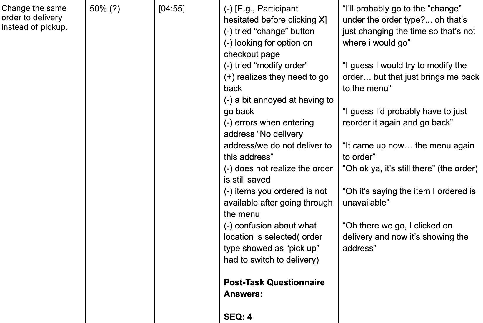 2) switch from delivery to pickup: all participants felt as though this task took way longer than it needed to, and all had significant issues completing the task without help.