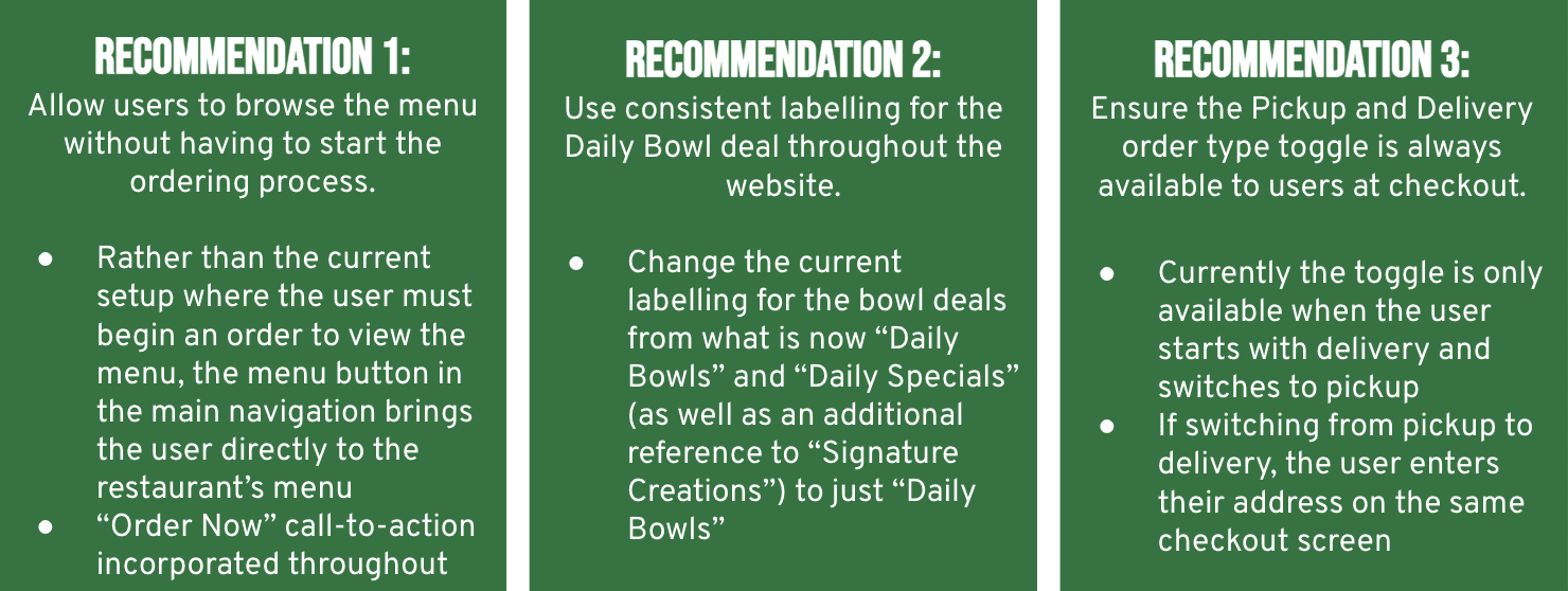 1) menu labelling: although participants found the daily bowl deal easily, they rated it as the least easy to complete because of the confusion with labelling