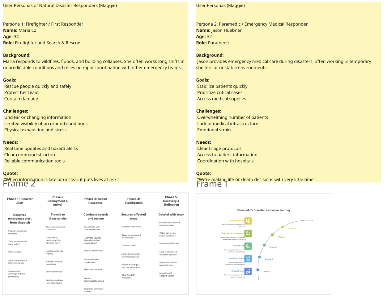 from here we created user personas to narrow down goals, challenges and needs of first responders. and, a journey map to gain a better understanding about how their needs change throughout the disaster response.