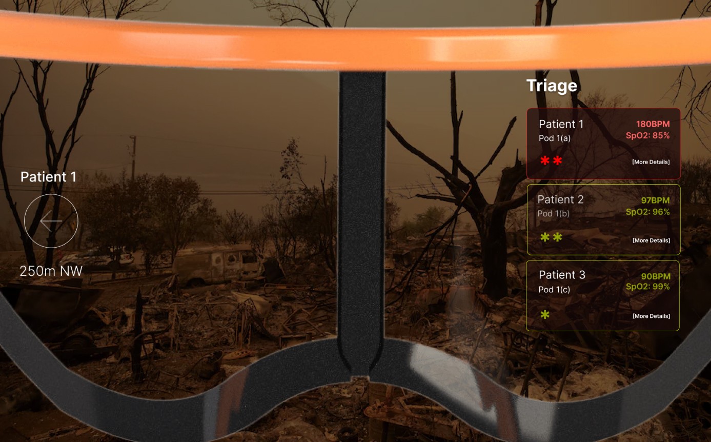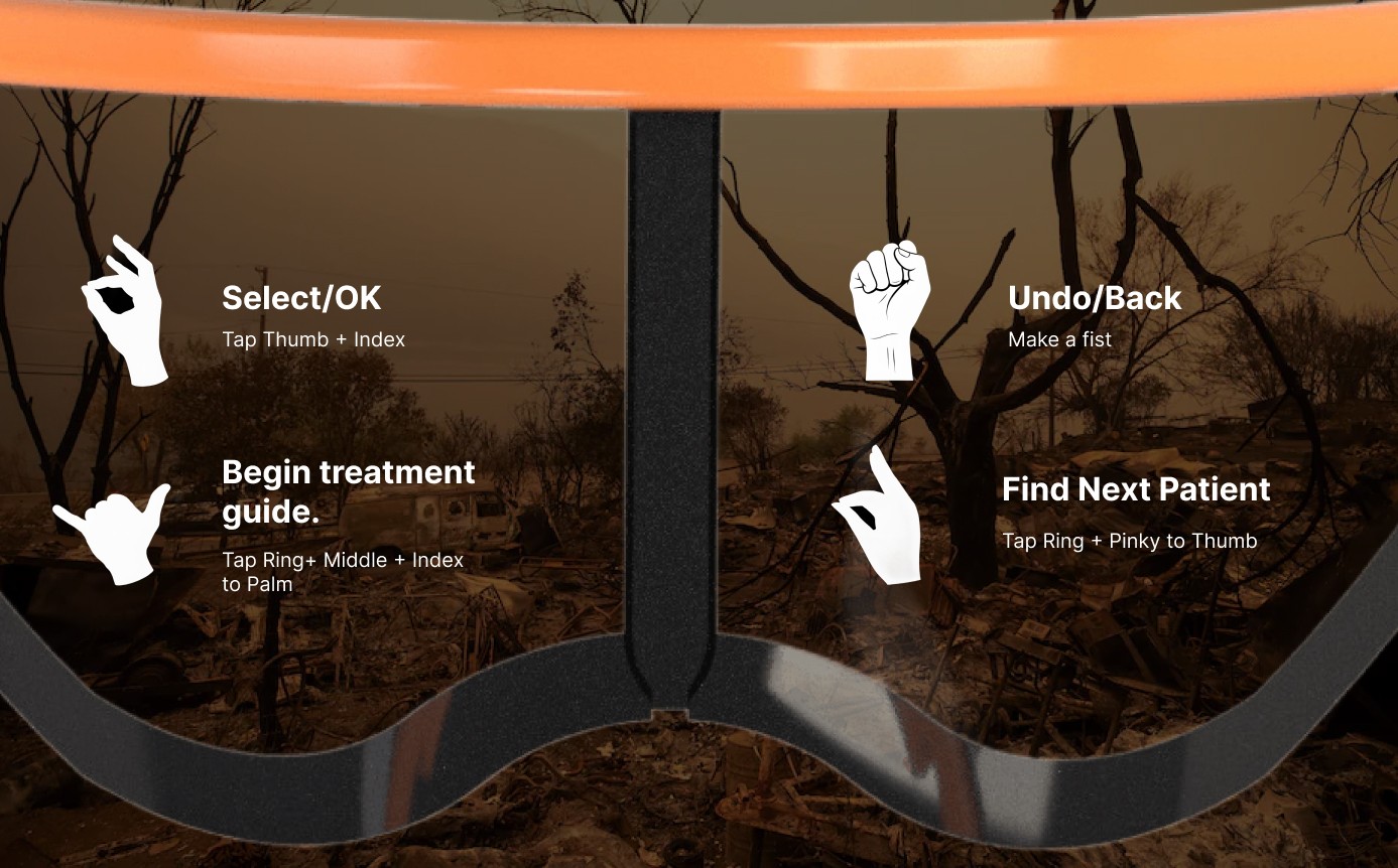 one part of the ecosystem i was in charge of designing is vitalsight, an ar wearable for first responders that provides real-time guided support, and the ability to monitor on assigned patients. the interface design was guided by ar usability heuristics. specifically, the interface shouldn't reduce visibility so as to prevent responders from doing their job. so it uses micro-gestures to bring up certain features to increase efficiency, and to better integrate the digital and physical experience.